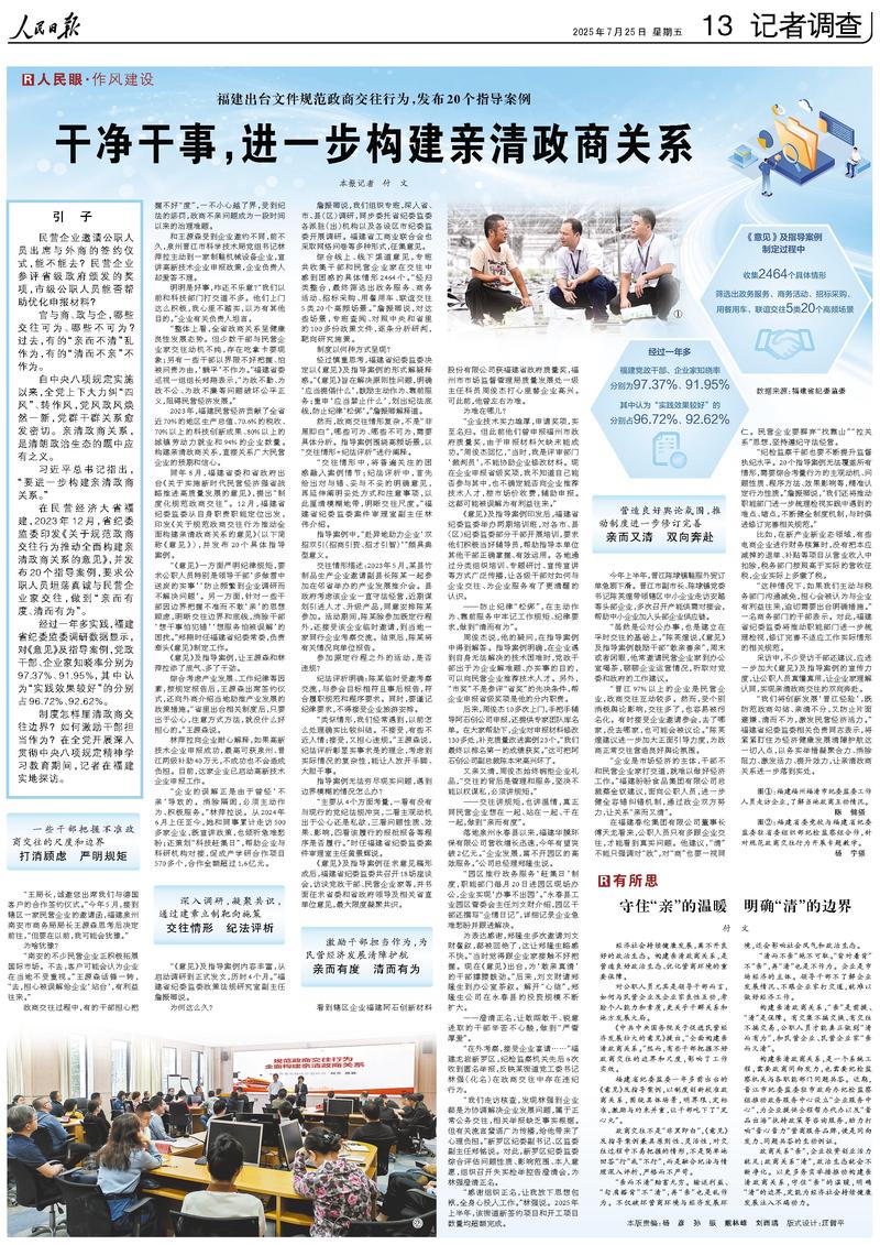 7月25日,《》第13版整版发布记者查询拜访文章,聚焦福建出台文件规范政商交往行为、发布20个指点案例,规范政商交往行为:《清洁干事,进一步建立亲清政商关系》,一路来看详情