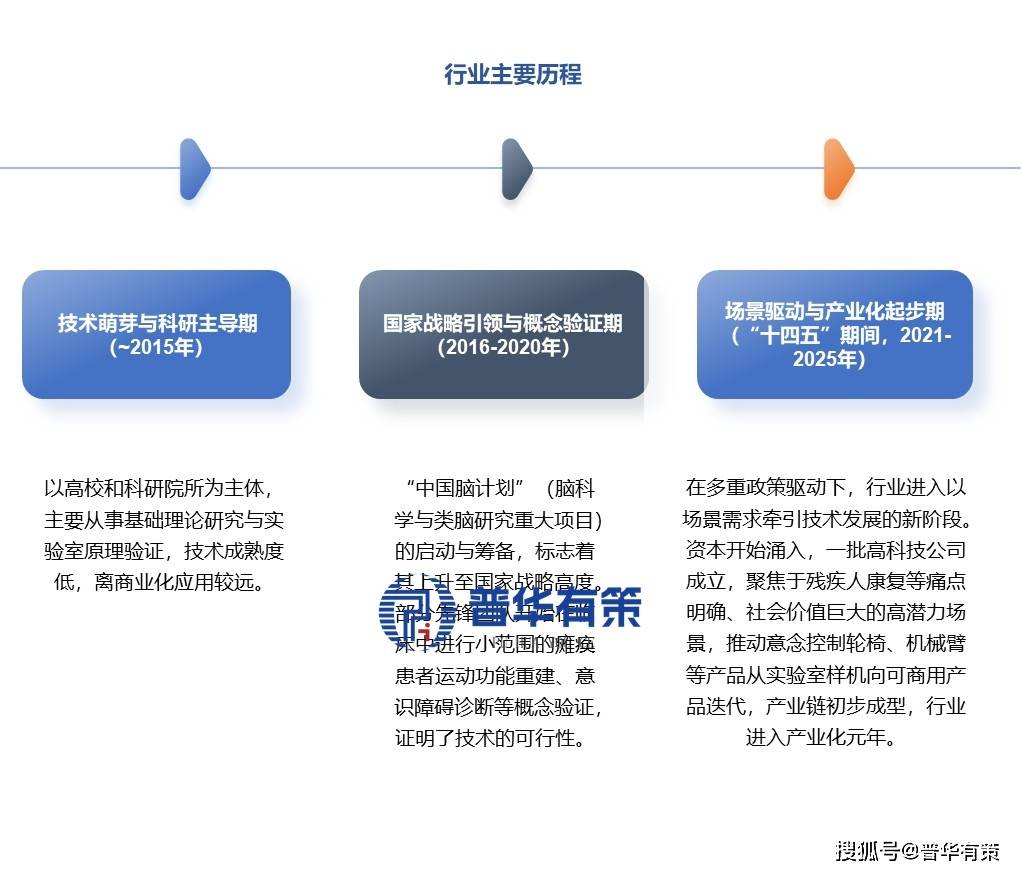 脑科学取脑机接口新场景使用行业是指基于脑电信号采集、解码取反馈节制手艺,实现人脑取外部设备间接交互,并正在医疗康复(如节制轮椅、机械臂)、消费电子、国防等新兴场景中落地的交叉手艺财产。其焦点手艺包罗非侵入式/侵入式脑机接口、神经信号处置算法、AI驱动的企图识别等。该定义契合《“十四五”生物经济成长规划》《关于加速场景培育和鞭策新场景大规模使用的实施看法》等政策中对“脑机融合”“神经调控手艺”的表述,强调以残疾人康复为焦点冲破口,办事“健康中国”取“配合敷裕”国度计谋。我国脑机接口行业履历了从根本研究逃逐到使用场景摸索的过程。