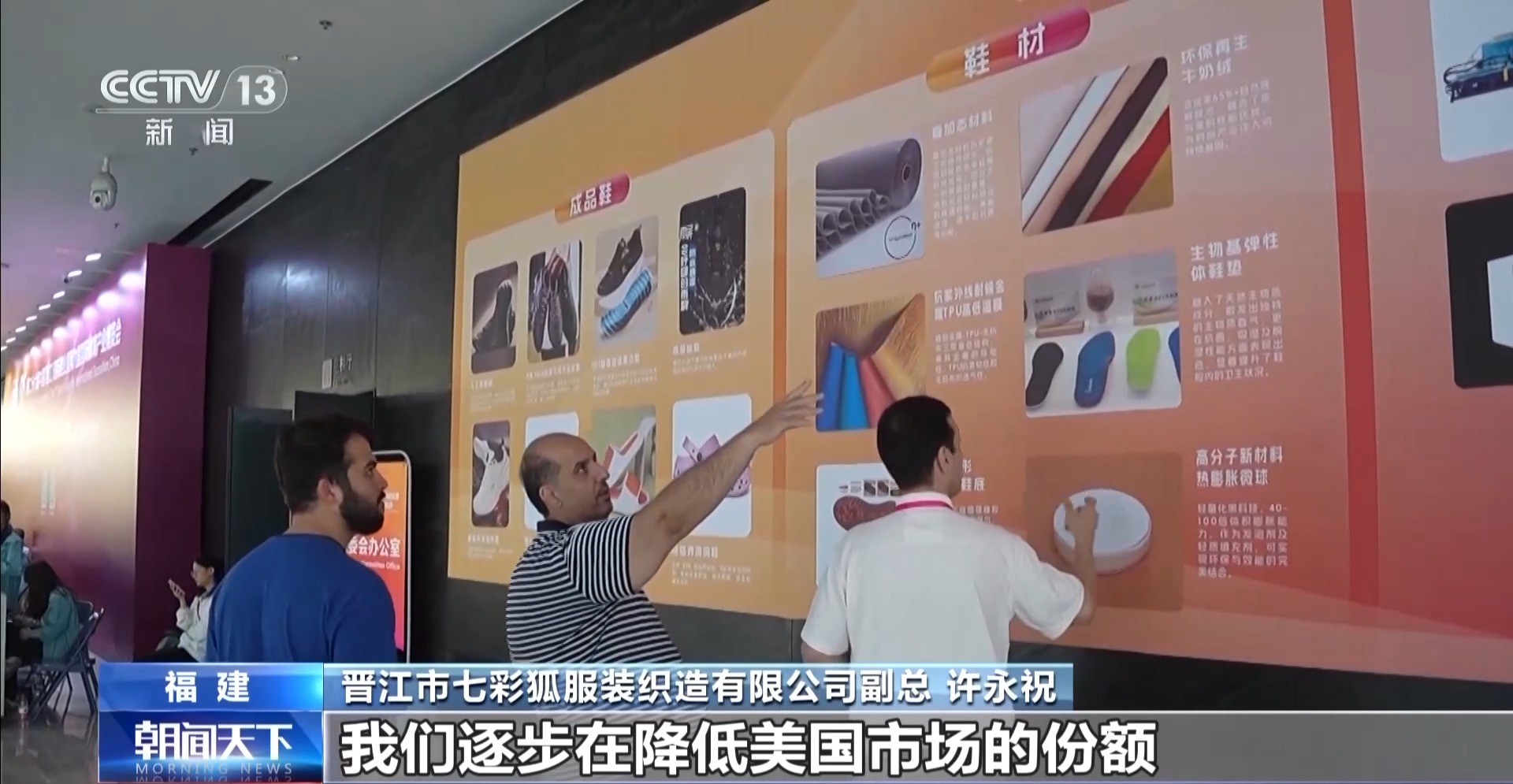 正在一年一度的晋江国际鞋业和体育财产博览会上,一家服拆企业的新品方才发布,企业担任人许永祝就送来了前来探厂的国际客商。