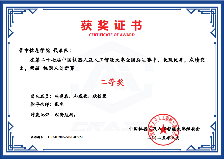 由 iCAN 大学生立异创业大赛组织委员会从办的 2025 年 iCAN 大学生立异创业大赛 “金视线杯”AI视觉检测设想挑和赛(省赛)落幕。赛事聚焦电子消息类、理工类专业AI视觉检测手艺使用,学校学子共斩获1项一等、8项二等、11项三等,此中张耀、曹怡宁、冯荣同窗团队取曹文婧、卫怡媛同窗团队2支步队成功晋级全国总决赛。由金砖国度工商理事会中方理事会、一带一暨金砖国度技术成长国际联盟等从办,杭州金视线 年第九届一带一暨金砖国度技术成长取手艺立异大赛“AI视觉检测设想赛项选拔赛”落幕。智能工程学院张耀、曹怡宁、冯荣团队荣获二等;袁舒灿、刘亚楠、栗江涛团队荣获三等。由全国三维数字化立异设想大赛组委会、国度制制业消息化培训核心、光华设想成长基金会结合承办的“第18届全国三维数字化立异设想大赛”中,学校智能工程学院斩获佳绩。正在省级角逐中,学校84名选手构成20支步队,此中由张虎、刘思婷教员指点贾云哲等同窗获得省级特等,由曹蓝天、陈杰教员指点王伟等同窗获得省级一等,由张虎、曹蓝天教员指点燕奕辰等同窗获得省级一等,由曹蓝天教员指点田朗等同窗获得省级一等,由曹蓝天、韩海豹教员指点宋相龙等同窗获得省级二等,由张虎、韩海豹教员指点等同窗获得省级二等,由张虎、马艳娥教员等同窗获得省级二等,由薛卫刚、教员指点钢等同窗获得省级二等,由郝建峰教员指点冯晋浩等同窗获得省级二等,由张虎、刘思婷教员指点等同窗获得省级二等,由、薛卫刚教员指点张泰铭等同窗获得省级三等,由曹蓝天教员指点等同窗获得省级三等,由郝建峰教员指点姚兴炜等同窗获得省级三等,由曹蓝天、教员指点卫泽辉等同窗获得省级三等,由郝建峰教员指点冯泉等同窗获得省级三等,由张虎、窦晨教员指点赵晨晨等同窗获得省级三等,由曹蓝天、教员指点郭思毅等同窗获得省级三等,由曹蓝天、康教员指点刘洋等同窗获得省级三等,由曹蓝天、郝建峰教员指点张子轩等同窗获得省级三等,由曹蓝天、孙连成教员指点王英杰等同窗获得省级三等,此中特等步队入围全国赛。学校智能工程学院员张程程教员荣获2025年高校员工做优良案例搜集评选勾当一等;任文姣教员荣获2025年高校员工做优良案例搜集评选勾当三等。正在2025年青年教师讲授竞赛山西赛区中,淬炼商学院张杏利从讲课程《公共经济学》获省赛三等。