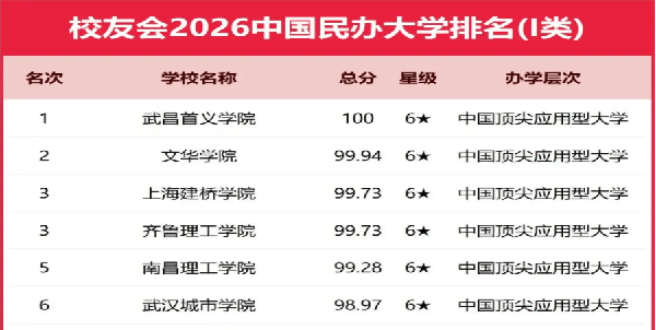 新年扬瑞气,骏马传佳音。1月12日,全国第三方大学评价研究机构艾瑞深校友会网2026中国大学排名沉磅发布。榜单显示,武昌首义学院以满分雄居2026中国平易近办大学排名第一,位列六星级中国顶尖使用型平易近办大学。自2006年来,武昌首义学院已持续21年连任校友会中国平易近办大学排名第一。校友会2026中国大学排名评价评价目标系统由办学条理、思政教育、讲授质量、高条理人才、精采校友、科研、科研项目、科研、社会办事、社会声誉和国际影响力等12大一级目标构成,基于“大平台、大团队、大项目、大、大校友”系统框架展开系统评价,涵盖的评价目标达900多项。评价院校涵盖我国海峡两岸暨澳门地域的2000多所公办本科大学、平易近办大学(含学院)、中外合做办学大学、职业手艺大学和高职(专科)院校等。校友会2026中国大学排名遵照中国大学分区分类分级分层的评价准绳,实施中国大学分类评价,将评价成果按照从榜、总榜进行评价和呈现,便于全国泛博读者科学客不雅对比阐发分歧排名中大学的排名环境。艾瑞深中国大学评价研究团队首席专家、中南大学蔡言厚传授指出,校友会中国大学排名贯彻落实国度教育文件方针政策,准确的教育评价导向取价值取向。艾瑞深研究团队是国内第三方大学评价的引领者,校友会大学排名评价系统的性、立异性和前瞻性远远领先于其他大学排行,公开辟表的校友会中国大学排名评价系统思惟、分类分级分区评价方式被多家国内排名机构自创仿照。源于开办以来,一直社会从义办学标的目的,落实立德树人底子使命,党的全面带领,传承华中科技大学工科劣势特色、严酷规范办理的“名校基因”和辛亥首义“敢为全国先”的“基因”,紧扣处所性、使用型定位,人才培育质量、办学程度和全体实力不竭提拔,办学获得社会高度必定。近年来,强化顶层设想,制定并实施“强内涵、显特色、成品牌”的“三步走成长计谋”,正在教育讲授、思政教育、学科专业、师资扶植、人才培育、质量保障、产教融合、科研办事、双创教育、国际交换和校园文化扶植等方面全面发力,取得显著成效。学校成功通过教育部本科讲授工做及格评估后,教育事业成长进入内涵扶植、特色成长、高质量成长,扶植特色明显的高程度使用型大学的新成长阶段。学校办学实绩显著,正在全省同类高校中,我校机械电子工程专业独一获批首批国度级一流本科专业扶植点。电视学等9个专业入选省级一流本科专业扶植点。《机械道理》等5门课程入选国度级一流本科课程,《告白的力量》等43门课程入选省级一流本科课程,实现了五类省级一流本科课程全笼盖。土木匠程力学-布局-施工焦点课程讲授团队等5个团队被评为省级讲授团队,市场营销系等6个组织被评为省级优良下层讲授组织。1项案例入选教育部教师人工智能使用培育案例,《融合旧事学导论》《品牌取筹谋》等课程获省级本科课程思政示范项目,清廉金句微网课入选教育部“一校一金句”收集微课名单。正在全国平易近办高校中,率先获批教育部“互联网+中国制制2025”产教融合推进打算试点院校,首获教育部新工科研究取实践项目,获批教育部产教融合实训优良案例,独一入选教育部“尝试讲授数字化及个性化评价系统”配合体单元。68个合做项目获批教育部产学合做协同育人项目。取华为、腾讯、中软国际、厚溥、华中数控等行业龙头企业共建财产学院4个,获批有省内独一1个省级高端配备智能运维现代财产学院。科学研究喜信频传,获湖北省科技前进3项,获批国度天然科学基金和社科基金项目9项、省部级基金49项,5个团队获批省级科技立异团队。获湖北省高档学校讲授一等1项、二等2项、三等4项。多次荣获中国两岸四地平易近办大学排行榜首、中国平易近办高校结业生合作力查询拜访十佳样本院校等各类誉称。学校是全国平易近办高校高质量成长协做体单元。2025年又获评央广网“标杆型平易近办高校”。2026年“十五五”开局起步环节一年,学校将继续推进实施强内涵、显特色、成品牌“三步走”计谋,以根基建成特色明显的高程度使用型大学为总方针,全面推进学校高质量成长,勤奋为教育强国扶植贡献力量。前往搜狐,查看更多。