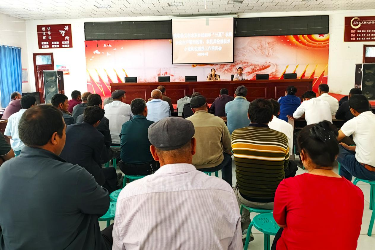 艾尔木东乡“三夏”农机平安出产警示教育、农机检修手艺及小麦机收减损工做培训会现场 (疏勒县委宣传部供图)。