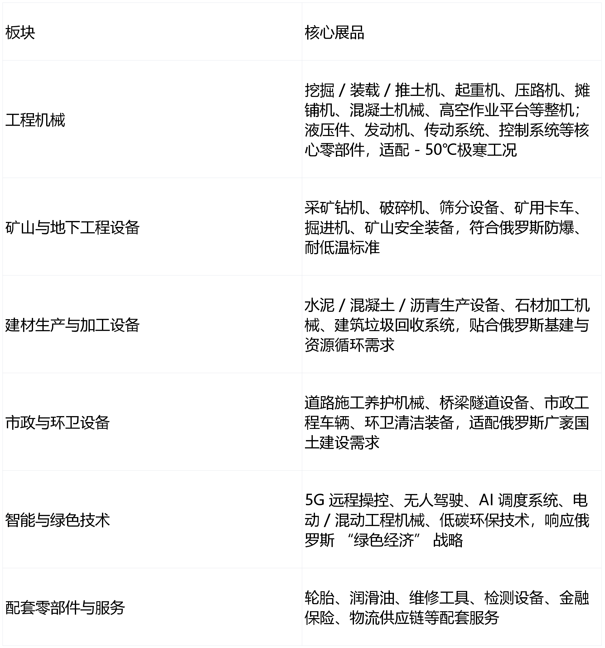 :总面积 11。9 万平方米,含室内展馆取室外动态演示区,四展联展总面积超 20 万平方米,适配大型机械静态展现取极寒工况动态演示,满脚零件取零部件全品类展出需求。:1746 家企业参展,来自 13 个国度,国际展商占比超 30%,卡特彼勒、小松、徐工、中联等全球头部品牌齐聚;中国展商约 200 家,起沉、矿山机械范畴构成劣势集群。:专业不雅众超 8 万人次,80% 为采购决策层,30% 来自哈萨克斯坦、白俄罗斯等中亚及东欧国度,焦点买家包罗俄罗斯铁、俄气集团等大型国企;同期举办 50 + 场手艺论坛、新品发布取极寒设备功课演示,促成合做金额超数十亿美元。:估计展览面积达 21。5 万平方米,展商冲破 1700 家,中国展商占比将达 35%,不雅众量无望破 10 万人,聚焦电动化、智能化、极寒适配手艺,强化中亚取中东欧商业对接。